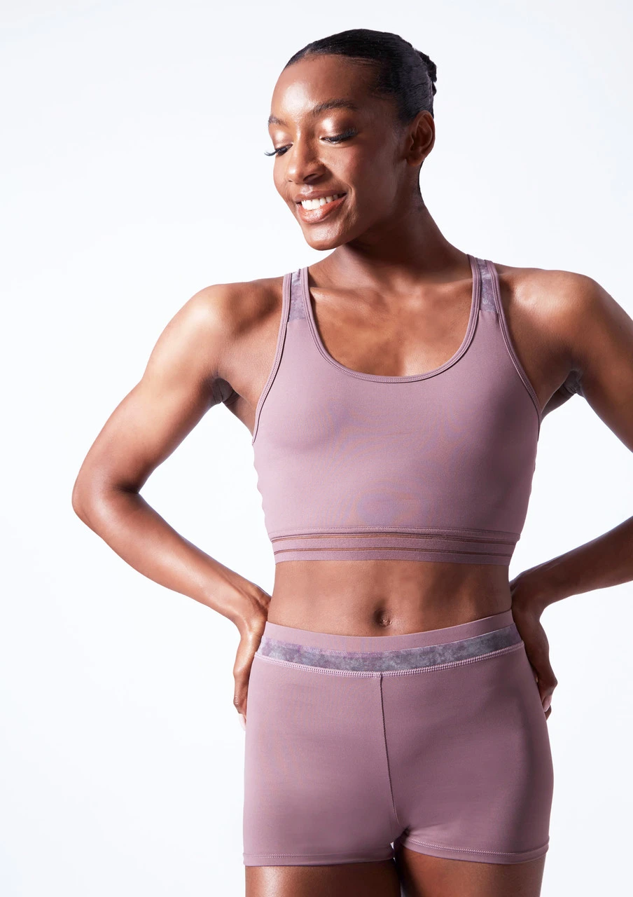 The ultimate dance shorts to look cool and keep comfortable for class. We love the high waisted look, complete with a spotted mesh detail waistband. Precious wears the shorts with the Move Dance Goda Camisole Leotard for a contemporary look. Part of the Precious Adams Collection.
