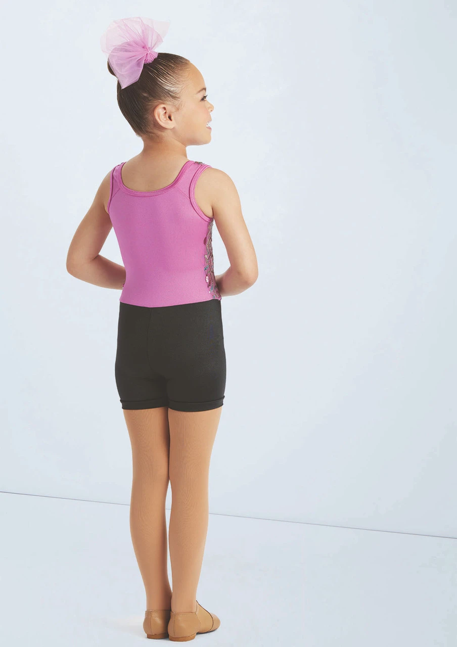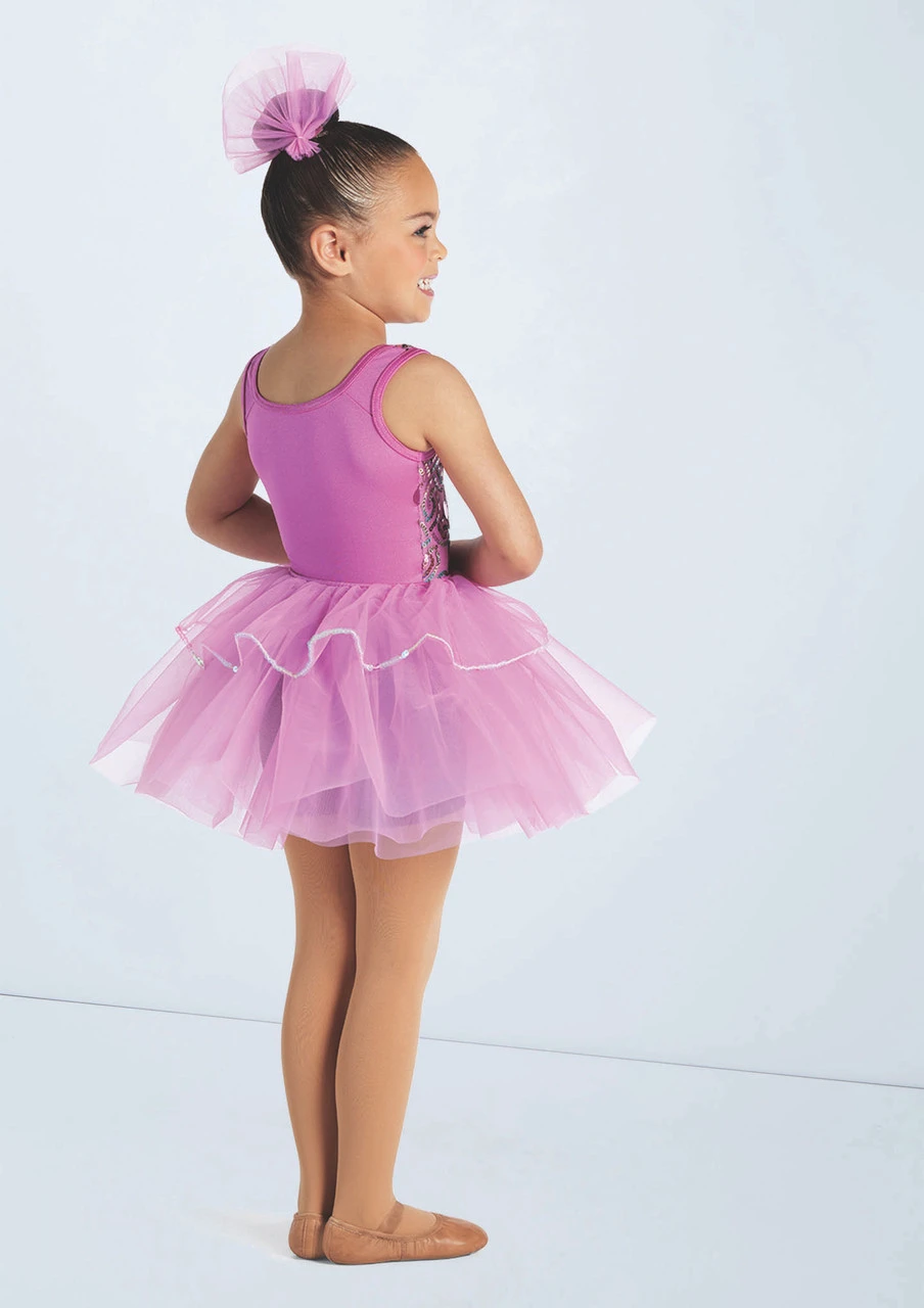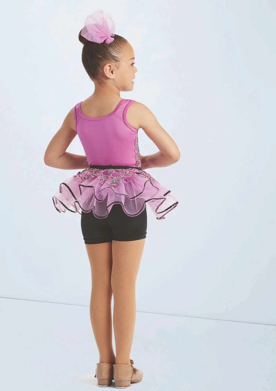Pull-on tricot tutu with sequin trim top skirt and jeweled bow