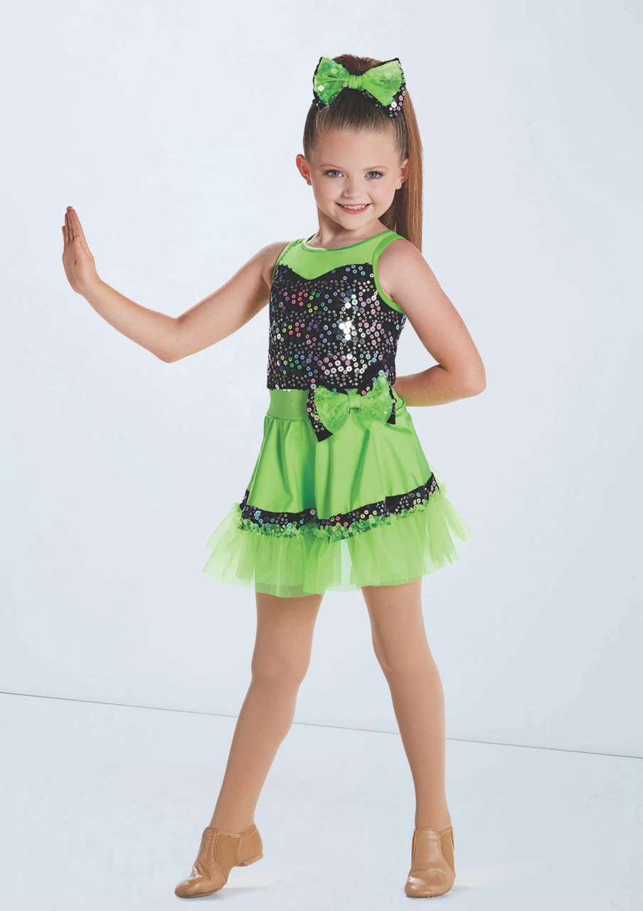 Dress has neon multi sequin velvet bodice and skirt trim