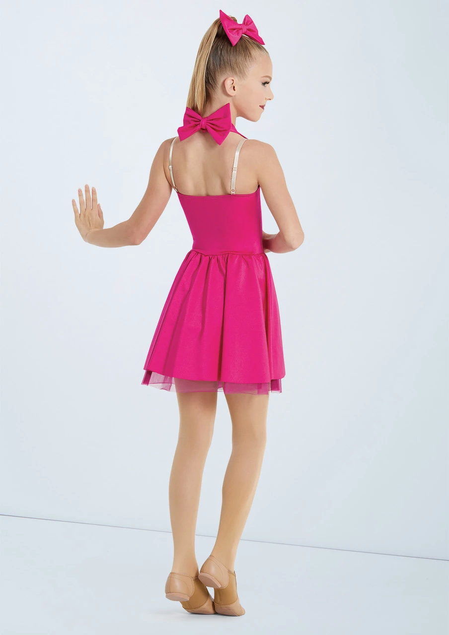 This fun, stylish halterneck dress with a sweetheart neckline is a perfect sweet costume for your dancers. The attached briefs and adjustable nude straps allow for comfort and flexibility. The snap closure at the back of the halterneck is discreet thanks to the large bow on the neck.