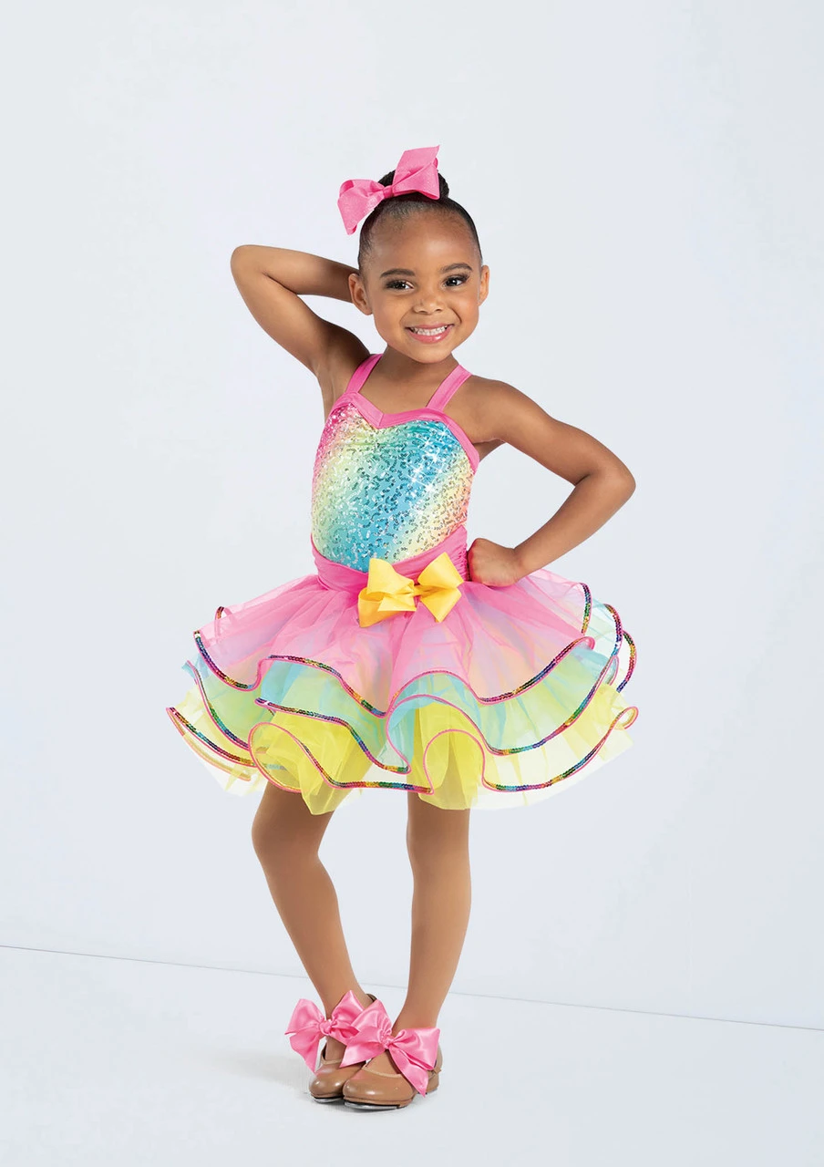 -Tiered curly hem tricot skirt features rainbow sequin trim