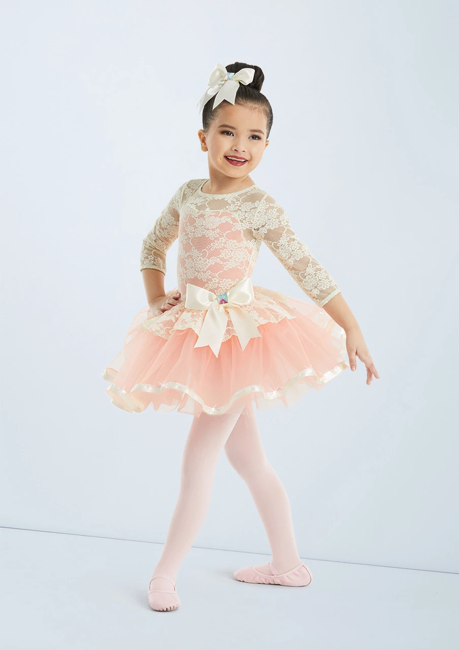 This lace costume is the perfect dress for a dainty and delicate performance from your little dancers. The 3/4 sleeve floral lace bodice paired with the glitter skirts provides the sweetest look. The G-hook closure allows for a quick change without touching hair and make-up so you’ve nothing to worry about.